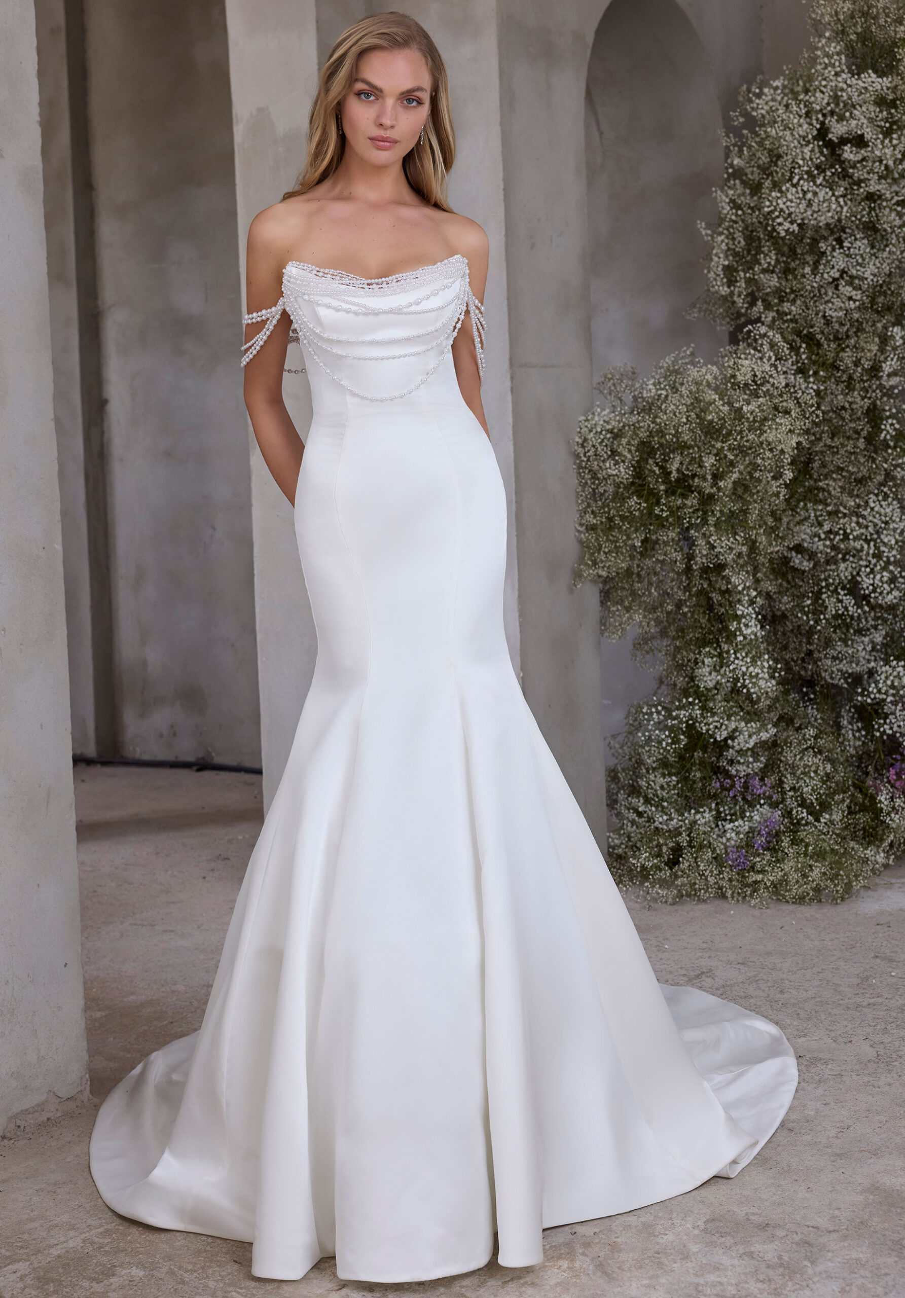 Satin fit and flare wedding dress has a strapless scoop neckline and princess seams with a detachable pearl drape. Bridal gown available without the pearl drape.