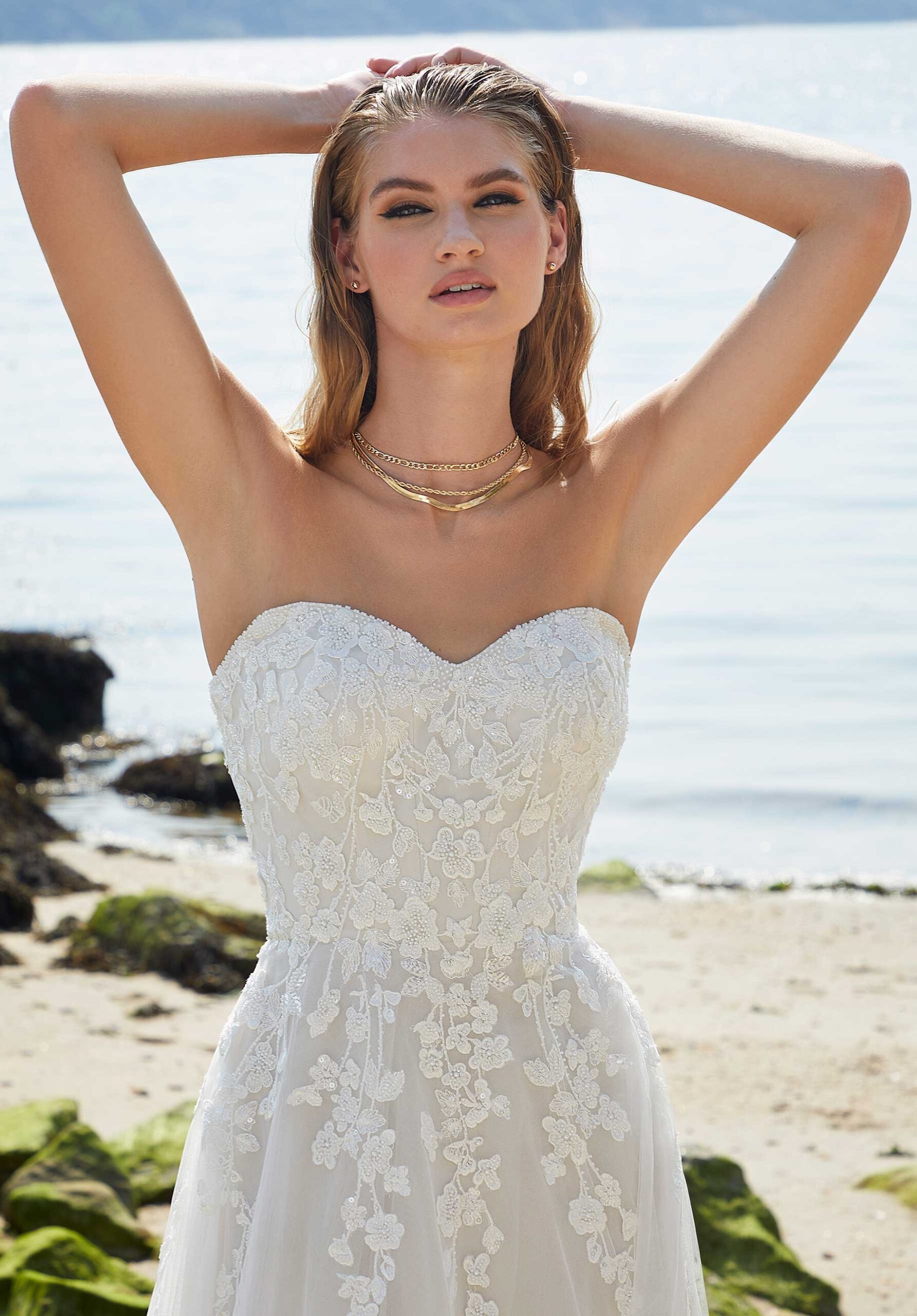Billowing A-line has a sweetheart bodice with beaded, embroidered lace on a tulle skirt with lace trimmed train and detachable sleeves.